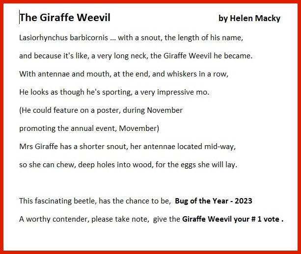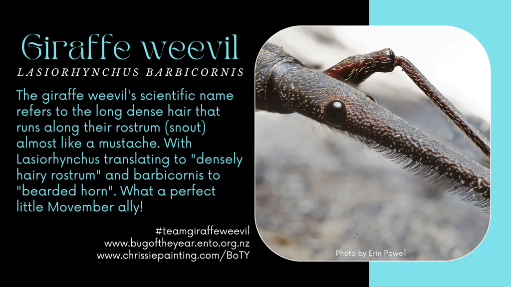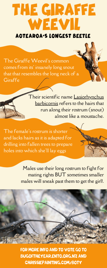 Follow our campaign and help us encourage more people to vote #teamgiraffeweevil on social media @cpaintingnz. (Don’t forget to use #BugOfTheYear2023 and tag @NZEntoSoc).