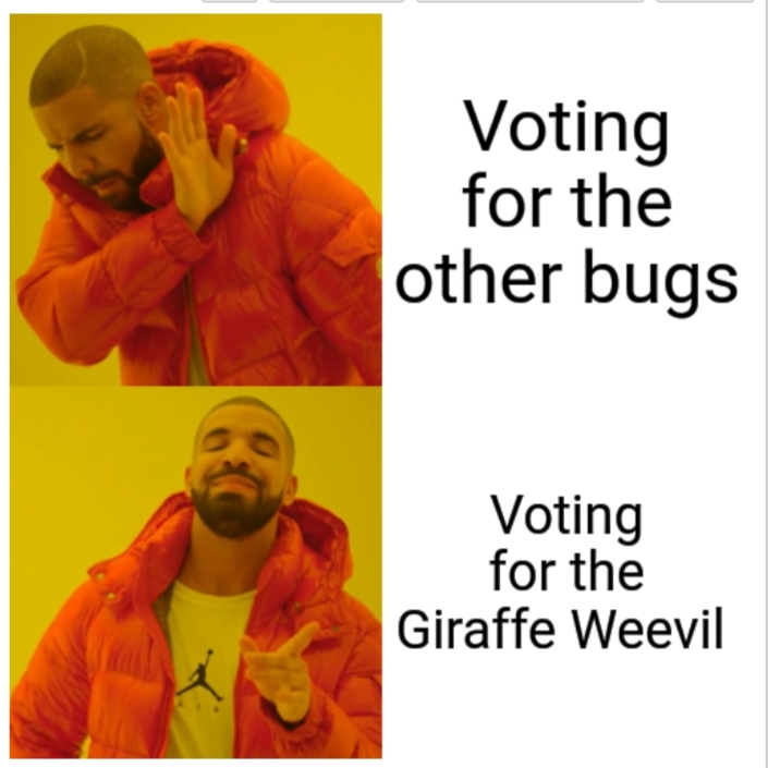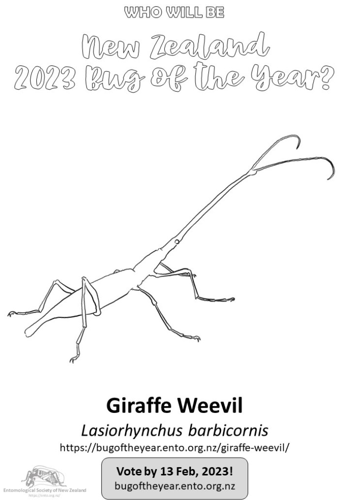 If you’d like to learn more aboutthe competition and its other (less exciting) nominees go to bugoftheyear.ento.org.nz. There you’ll also find information on how to add your vote to NZ Bug of the Year 2023. Don’t hesitate! Go join in on the fun and vote for Aotearoa’s best bug: The New Zealand giraffe weevil!
